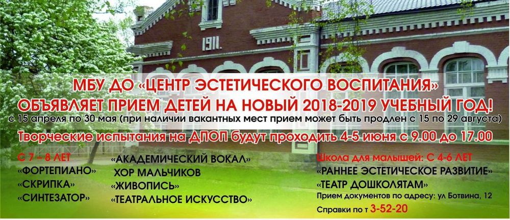 Центр создан как комплекс в котором переплетаются формы работы разных учреждений культуры – школы искусств, филармонии, выставочного зала. Сейчас в Центре эстетического воспитания обучается 265 учащихся на музыкально-исполнительском, художественном отделениях, в школе для малышей «Страна фантазия».