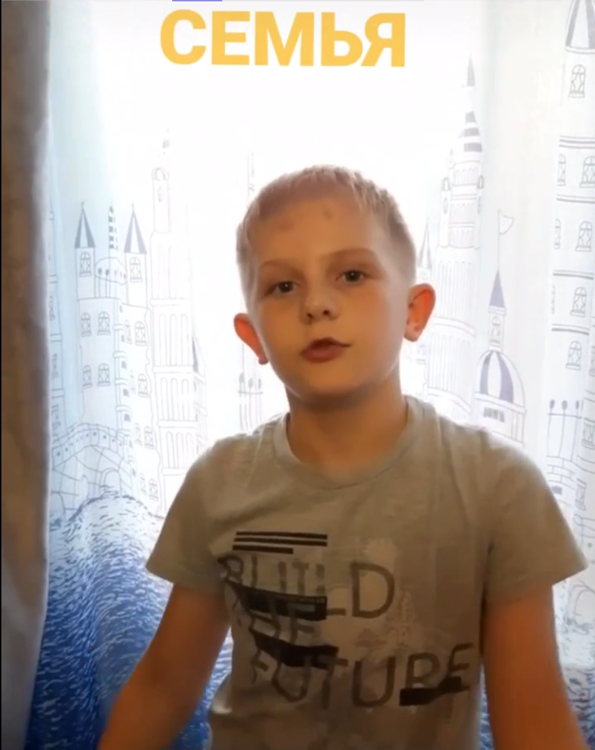 Ответ сыночка, что для него Семья в коротком видео. Это папа, мама, сестрёнка, он и наш котик Бася.И конечно бабушка И он их очень любит!!